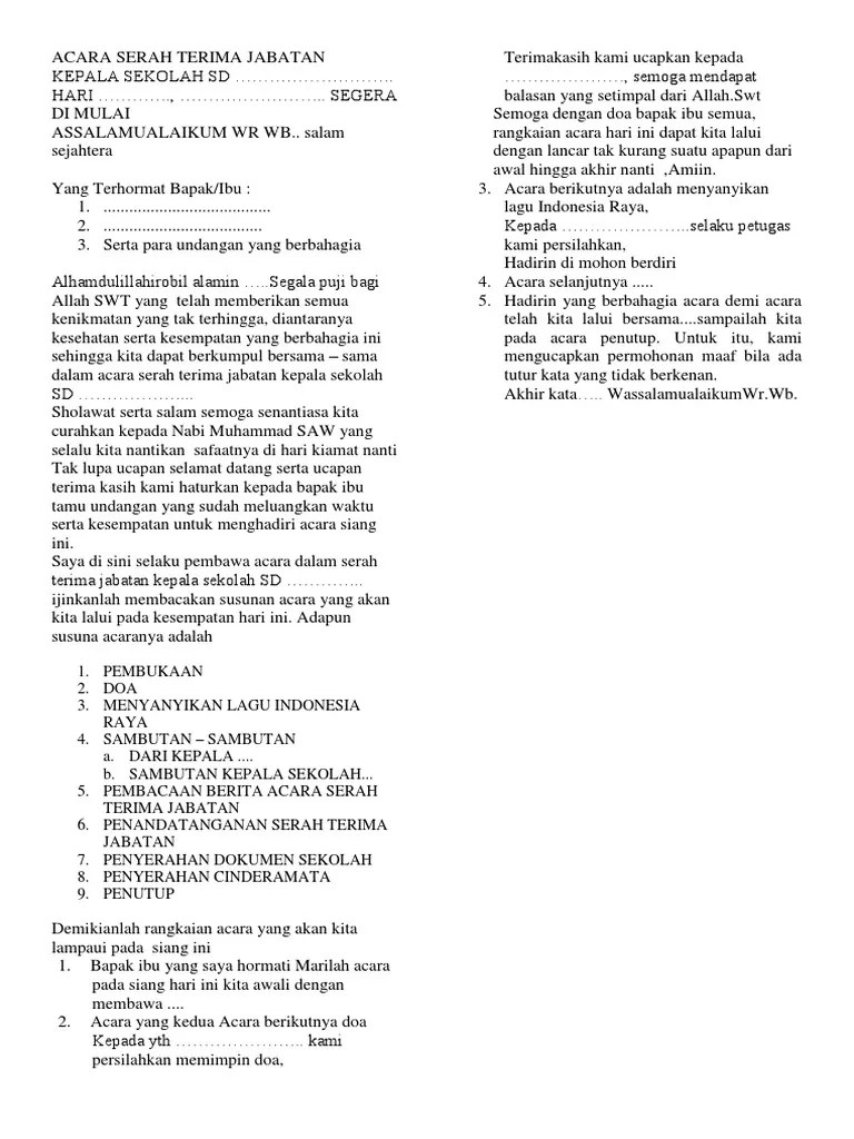 Ada tiga sambutan dalam acara serah terima jabatan tersebut. Jadi untuk dapat berpidato dengan baik, maka anda akan membutuhkan contoh teks pidato perpisahan yang dapat anda simak sebagai beirkut. Pisah sambut kapolres lampung barat tahun 2019. 66 contoh pidato perpisahan pisah sambut hal positif dan kesan. Pisah sambut yang kita laksanakan ini sebagai. Pisah sambut dan serah terima . Kecamatan busungbiu menggelar acara pisah sambut dari pejabat lama camat busungbiu, antara i gede putra aryana,s.sos.,map kepada pejabat . Sambutan pejabat baru dalam serah terima jabatan kepala desa karangjambe. Doc contoh naskah pidato pisah sambut ayu atqia . Contoh pidato serah terima jabatan contoh 1 assalamualaikum warahmatullahi. Dalam sambutan perpisahannya, pak suyatno mengharapkan sekali kepada bapak nanang utuk bisa melanjutkan usaha mereka dalam meraih wbk. Sambutan yang pertama adalah dari ibu hindanah dalam sambutannya menyampaikan terima kasih kepada . Contoh kata sambutan pisah sambut menarik.